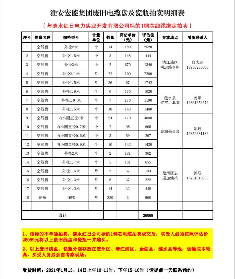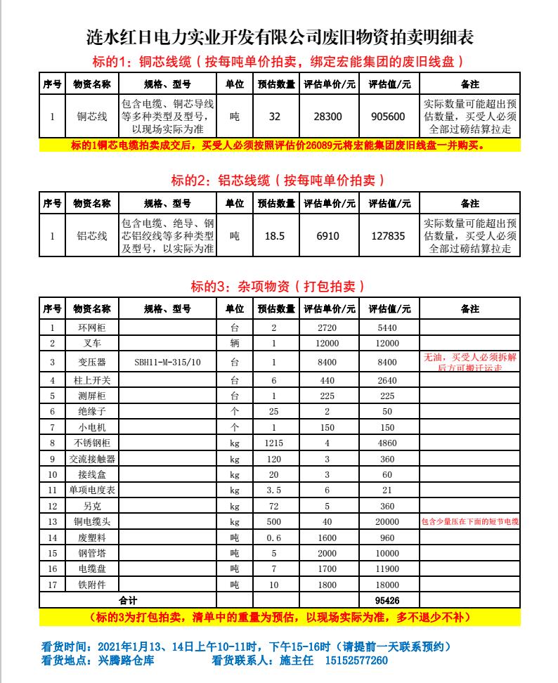 關(guān)注微信公眾號(hào)受委托,我公司將通過中拍平臺(tái)以網(wǎng)絡(luò)競價(jià)的方式公開拍賣以下單位廢舊電力物資。主要包含:廢舊電纜盤、銅芯電纜、鋁芯電纜、鋼管塔、鐵附件、開關(guān)柜、變壓器、雜項(xiàng)物資等。