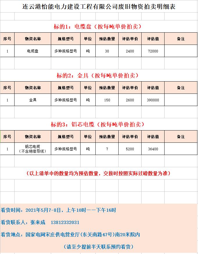 1、連云港怡能電力建設(shè)工程有限公司廢舊物資。主要包含:廢舊鋁芯電纜、金具、電纜盤(pán)、雜項(xiàng)物資等。(保證金10萬(wàn)元)