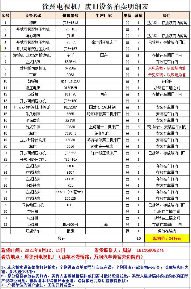 1、徐州電視機(jī)廠廢舊設(shè)備一批。包含:沖床、壓力機(jī)、折邊機(jī)、鉆床、機(jī)床、車床、刨床、磨床、銑床等、空壓機(jī)、電焊機(jī)等。(競(jìng)買人須為具有再生資源回收資質(zhì)的企業(yè)法人),保證金5萬元。